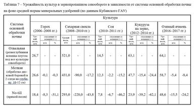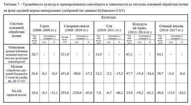 Следует отметить, что снижение в урожайности возделываемых культур на фоне системы no-till наблюдалось и по отношению к варианту с мелкой обработкой почвы.
