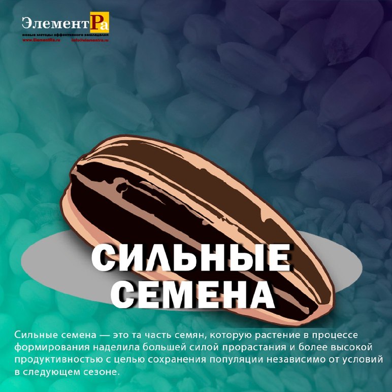 Технология СИЛЬНЫЕ СЕМЕНА — это надежный путь повышения урожайности любых с/х культур без снижения плодородия почвы, при одновременном снижении химической нагрузки на нее. Суть технологии — это выделение сильных семян – то есть выполненных, более тяжелых при их одинаковых размерах, не имеющих микро- и макротравм, и инокулирование их перед севом микробными препаратами. СИЛЬНЫЕ СЕМЕНА — позволяют уменьшить посевную норму, обеспечить точный высев, получить дружные выровненные всходы, равномерное развитие растений, одновременное созревание и повышение урожайности минимум на 20%. Данная «Щадящая пофракционная технология Фадеева» успешно себя показывает при производстве зерновых, крупяных, масличных и технических культур.