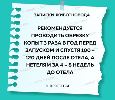 1. Проводите обрезку копыт 3 раза в год. Для удобства учета обработанных животных и их наименьшего стресса, проводите обрезку перед запуском и спустя 100-120 дней после отела, нетелям - за 4-8 недель до отела. Положительный эффект от процедуры длится до 4 месяцев. Видео "Профилактическая обрезка копыт".