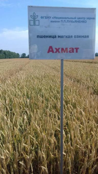 - Ахмат - полукарликовый, высота растений 80-85 см, высокоустойчив к полеганию. Среднеспелый, колосится и созревает одновременно с сортом Гром. При перестое не прорастает, не осыпается.