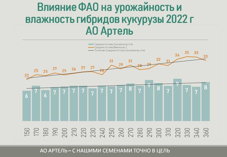 3. Отмечено 2 точки подъема урожайности гибридов в зависимости от ФАО - 170 (свыше 7 тн), 270 (свыше 8 тн). Влажность увеличивалась по мере роста ФАО.