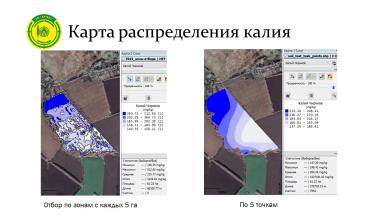 Полученные данные мы также загрузили в программу картирования с помощью Агроштурмана. И вы наглядно можете сравнить картинки, которые получаются разными в зависимости от метода отбора проб.(см слайд 5-8). Согласитесь, картинки имеют мало общего.