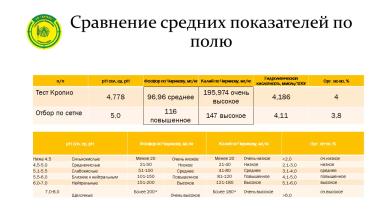 При формировании технического задания мы не ставили себе целью сделать карты почвенного анализа для дифференцированного внесения удобрений. Нам нужна была итоговая цифра по полю по каждому параметру. Если смотреть с этой точки зрения, то средневзвешенные показатели по полю получились близкими. Однако если рассматривать их с точки зрения градации по группам обеспеченности элементами питания, то фосфор и калий оказались в разных группах.