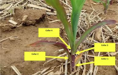 Наиболее распространенным способом определения вегетативной стадии роста кукурузы является использование метода «воротника». «Воротник» — это место соединения листовой оболочки и листовой пластинки. Для этого метода просто подсчитайте количество видимых «воротников», включая первый закругленный лист. В примере, показанном на рисунке 2, считая снизу, мы видим четыре листовых «воротника», показанные стрелками; следовательно, эта кукуруза находится на стадии роста V4.