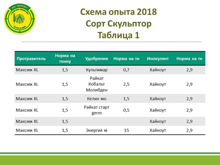 Для опыта были выбраны препараты, которые можно наносить на семена. Фоном служило протравливание Максим XL в баковой смеси с испытуемыми препаратами и следующим слоем наносили инокулянт Хайкоут. В 2018 году был заложен эксперимент на сорте Скульптор. В 2019 году победителя испытания проверяли уже на 5 сортах и в компании с новой партией участников. Итак, действующие лица 2018 года (см таблицу 1). В течение вегетации мы копали и искали различия. Мы видели отставание от контроля варианта с Энергией М. И также видели визуально бОльшее количество клубеньков на варианте с Райкат Кобальт Молибден.