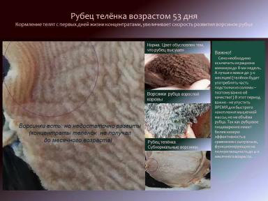 Совет. Чтобы телочка была готова к осеменению в раннем возрасте нужно делать все для развития ее рубца. Для стимуляции развития ворсинок рубца особенно важна пропионовая кислота, которая образуется в рубце жвачных животных в результате ферментации кукурузы, ячменя, сена, соломы, сухого свекловичного жома и т.д. Важную роль в развитии ворсинок рубца играет и масляная кислота. Поэтому в монокорм для телят в постмолочный период должны быть включены помимо крахмалсодержащих и такие компоненты как жмыхи и шроты, отруби, кукурузный и подсолнечный силос, и/или сено и сенаж злаковых и бобовых трав.