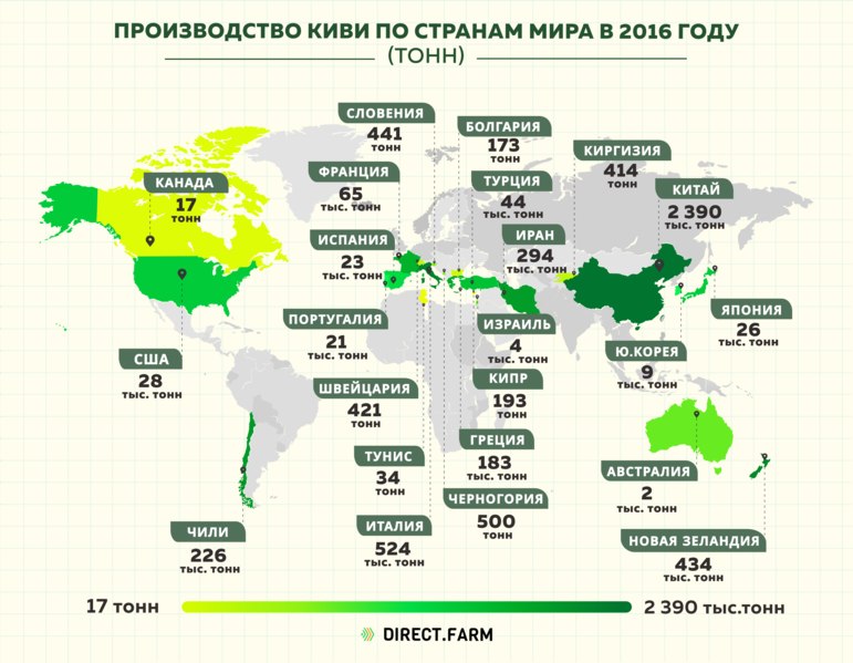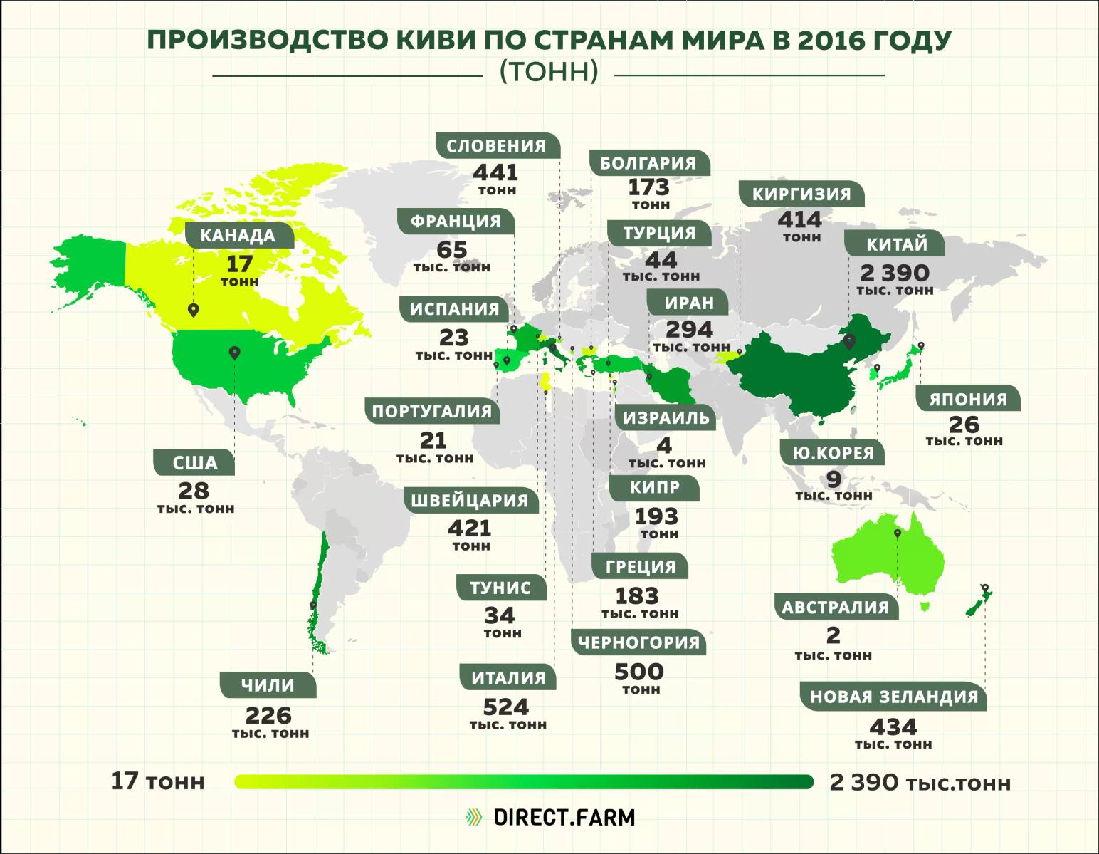 Крупнейшими производителями киви являются Китай, Италия, Иран и Чили.