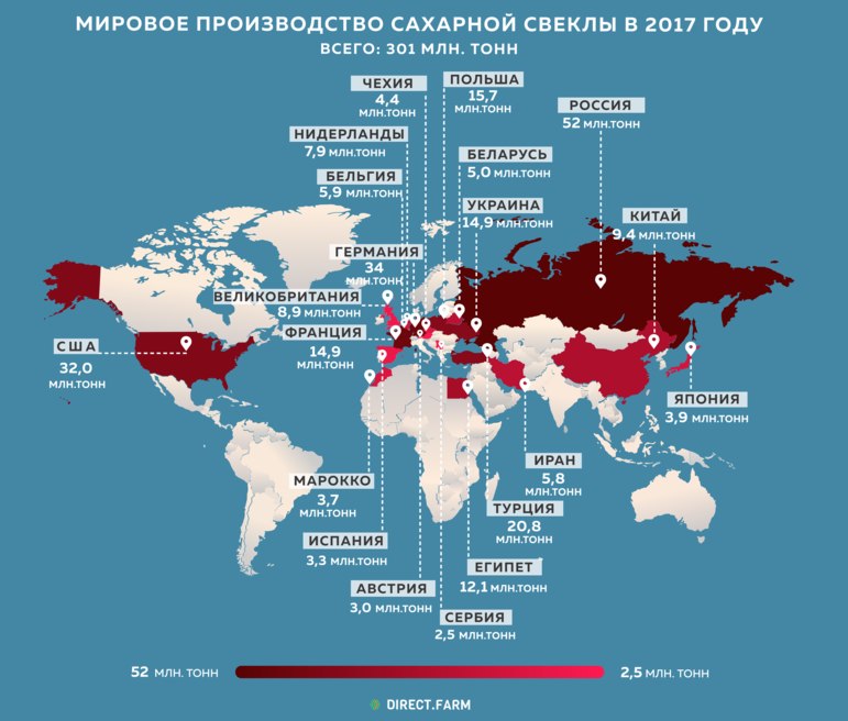 В 2017 году Россия заняла первое место в мире по выращиванию сахарной свёклы. Второе место заняла Франция – 34,4 млн тонн, немного отстала Германия с производством 34 млн тонн.