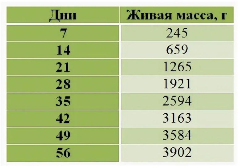 Таблица набора массы уток мясного направления.