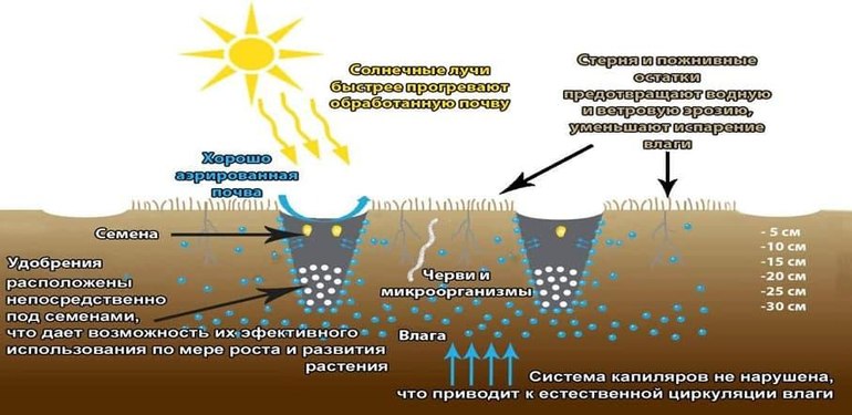 Ее суть заключается в обработке, путем рыхления , только узких полос поля, в которые и производится высев. В междурядьях почва не обрабатывается. Полосы обработанной почвы занимают не более 1/3 площади поля, на котором в среднем остаётся 50-75% растительных остатков.