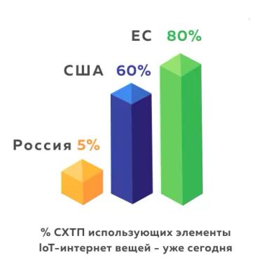 По данным Агрофизического НИИ элементы интернета вещей (Internet of Things – IoT) уже используют до 5 % сельхозпроизводителей в России, в США – 60 %, в ЕС – 80 %.