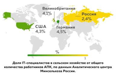 В России на 1000 человек занятых в сельском хозяйстве приходится примерно один IT-специалист, а всего их около 112,9 тысяч IT-специалистов в отрасли сельского хозяйства или 2,4 % от всего населения, занятого в сельском хозяйстве.