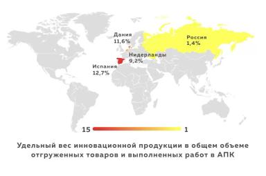 На основе рейтинга стран по уровню инноваций Global Innovation Index-2017 – Россия находится на 45 месте из 127 участников рейтинга. По данным FAO ООН нераскрытый потенциал урожайности сельхозкультур составляет около 30%. По данным НИУ ВШЭ удельный вес инновационной продукции в общем объеме отгруженных товаров и выполненных работ в АПК в России составляет 1,4 %, для сравнения Испания – 12,7 %; Дания – 11,6 %; Нидерланды – 9,2 %;