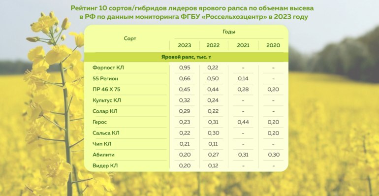 Среди многообразия сортов/гибридов ярового рапса лидером в 2023 году стал сорт Форпост КЛ селeкции ВНИИМК. По данным Россельхозцентра остальной список сильно изменился: сорт Юбилейный и гибриды Джаз КВС, Белинда, Джером сменились на гибриды Солар КЛ, Чип КЛ, Ведер КЛ.