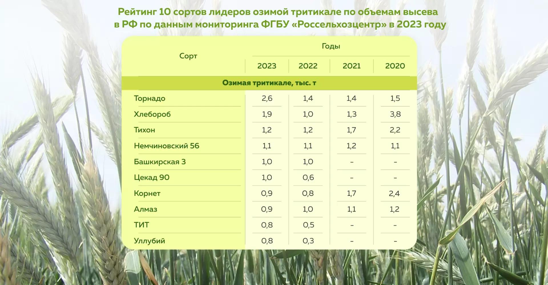 🌾 Наиболее распространенные в Российской Федерации сорта озимой тритикале за 2023 год: Торнадо, Хлебороб, Тихон и другие. Сорта Цекад 90, ТИТ и Уллубий вытеснил из рейтинга сорта Башкирская короткостебельная, Сирс 57 и Консул.
