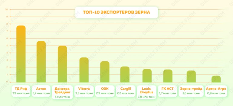 Лидером по объёму поставок стала компания ТД «Риф», на долю которой пришлось 7,9 млн тонн экспорта зерна. Генеральный директор предприятия прогнозирует, что финальные показатели сезона будут выше.