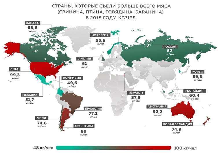 Среди стран, потребляющих большое количество мяса (свинина, птица, говядина, баранина), чемпионом стали США – 99,3 кг/человека. Не далеко ушла Австралия – 92,2 кг/человека — это второе место. В тройку лидеров вошла Аргентина – 89 кг мяса на человека в год.