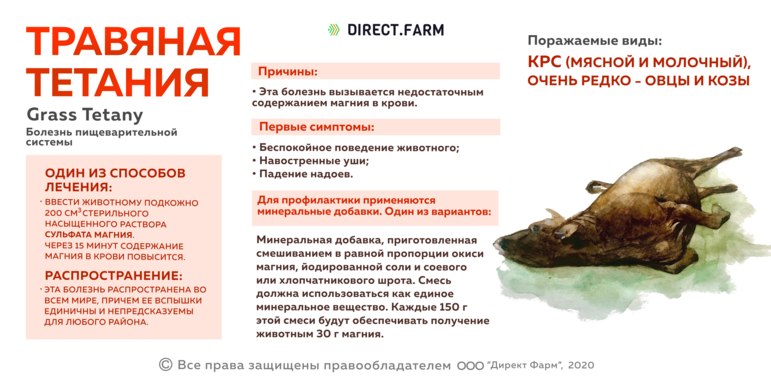 Важно: травяная тетания, наиболее вероятно, вспыхивает там, где пастбищные травы растут на почвах с низким содержанием доступного магния и высоким содержанием усвояемого калия. Если содержание кальция в почве также низко, как и содержания магния, опасность возникновения болезни еще выше!