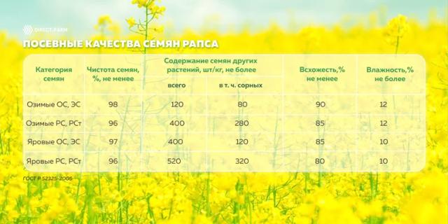 Чистота оригинальных (ОС) и элитных (ЭС) семян должна быть не менее 99%. Чистота репродукционных семян (РС) и репродукционных семян на товарные цели (РСт) не менее 98%.