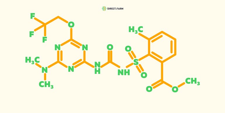 Производные сульфонилмочевины. Селективный гербицид системного действия. Трифлусульфурон-метил ингибирует ацетоактатсинтазу – фермент, отвечающий за образование аминокислот валина, лейцина и изолейцина. Ингибирование ацетолактатсинтазы приводит к остановке роста и к гибели сорных растений спустя несколько часов после обработки.