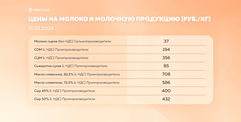На 15.05.2024 среднероссийские цены на молоко сырое составили 37,00 руб./кг (0% за неделю), на сухое обезжиренное молоко (СОМ) – 194,00 руб./кг (+2,5% за неделю), на сухое цельное молоко (СЦМ) – 356,00 руб./кг (-3,2% за неделю), на сыворотку сухую – 85,00 руб./кг (+1,1% за неделю), на масло сливочное 82,5% – 708,00 руб/кг (+2,9% за неделю), на масло сливочное 72,5% – 586,00 руб./кг (-3,6% за неделю), на сыр 45% – 400,00 руб./кг (0% за неделю), сыр 50% – 432,00 руб./кг (-2,2% за неделю).