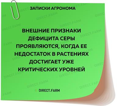 13. Все чаще причиной недобора урожая и потерь его качества, по данным анализа, оказывается дефицит серы. Если всем остальным элементам питания оказывается достаточное внимание (даже микроэлементам), то сера всегда отодвигается на второй план.