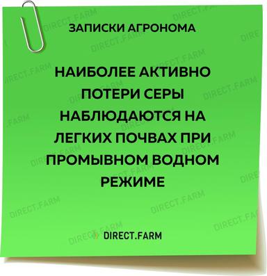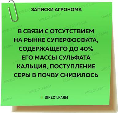 Снижение поступления серы в почву с удобрениями связано с тем, что все больше сейчас используется азотных и фосфорных удобрений, в состав которых данный элемент не входит (мочевина, аммиачная селитра, аммофос).