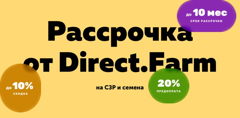 Поставщики предоставляют нам эксклюзивные условия за счет ускоренного процесса получения денег в виде 100% предоплаты, где 20% - это первый взнос сельхозпредприятия, а 80% - финансирование покупки Direct.Farm. Именно полученная от поставщиков скидка дает нам возможность предоставить самые выгодные условия на рынке. Сумма, которую мы представляем вам в рассрочку, выплачивается в срок до 10 месяцев. В логистических решениях никаких изменений, агрономическое сопровождение остается на прежнем уровне - мы не нарушаем привычный вам рабочий цикл, мы делаем его более качественным и удобным. Подробнее об условиях, порядке получения и специфике рассрочки можно прочитать здесь. Нажимая кнопку «купить», вы получите бесплатную консультацию от наших специалистов, которые помогут подобрать подходящий препарат, ответят на все ваши вопросы, расскажут о деталях сделки и помогут оформить заказ.