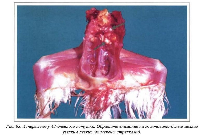 Aspergillus fumigatus. Главный фактор передачи – загрязненная пометом подстилка. Цыплята обычно заражаются вскоре после вылупления или в течение первых двух дней в брудере (“брудерная пневмония”)