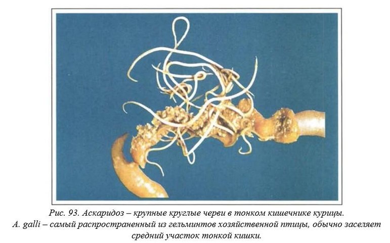 Ascaridia galli. Аскариды – наиболее крупные из нематод птицы. Личики аскарид попадают в кишечник, взрослые паразиты обитают в просвете тонкой кишки.