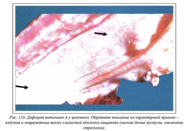 У взрослой птицы изменения при дефиците витамина А первоначально проявляются в глотке и пищеводе. Протоки желез слизистых оболочек блокируются, развиваются небольшие белые пустулы (узелки, пузырьки), содержащие секреты и отмершие клетки. Пустулы хорошо заметны на вскрытии и являются характерной особенностью нехватки витамина А (рис. 110, 111). Яйценоскость падает, выводимость снижается.