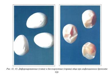 - При синдроме поражения репродуктивных органов снижается яйценоскость, иногда – более чем на 50%. Через 3-4 недели яйценоскость может нормализоваться, но качество яиц снижается. Яйца могут быть мелкими, деформированными (рис. 42), с истонченной скорлупой или бесскорлупными (рис. 43), иметь кальциевые отложения на поверхности скорлупы. Белок яйца теряет вязкость, водянистый, теряется четкая граница между наружным и внутренним слоями, свойственная нормальному яйцу.