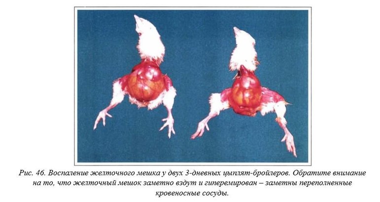 Результаты вскрытия. Кровеносные сосуды желточного мешка расширены и переполнены кровью (рис. 46, 49). Застойные явления в легких; печень и почки темного цвета, увеличены. Самая важная находка – воспаленный неабсорбированный остаток желтка, отличающийся от нормального по цвету и консистенции (рис. 47, 48, 50), обычно зловонный. Часты перитонит и кровоизлияния на поверхности кишечника.