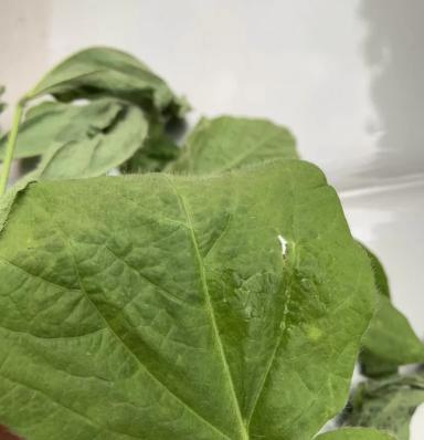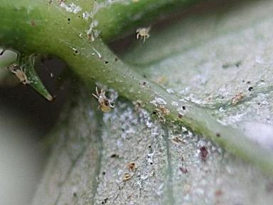 Поражения паутинным клещом ( Tetranychus urticae), обнаруженны на 3 верхних ярусах культуры, белёсое круглое пятно, с чёткой каймой, со временем центр становится коричневым м выпадает, образуя отверстие внутри пятна.