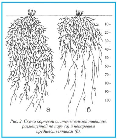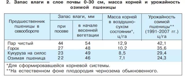 Исследование от Донского зонального НИИ сельского хозяйства Ростовской области о развитии корневой системы озимой пшеницы в зависимости от содержания в почве влаги, которая меняется с предшественником и обработкой почвы (2009 г.).