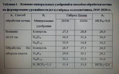 Таблица 1 – Влияние минеральных удобрений и способов обработки почвы на формирование урожайности (ц/га) гибрида подсолнечника, 2019-2020 гг.