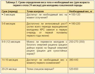 В специализированной как национальной, так и международной литературе, сообщается, что (голштинские) коровы, которые отелись впервые в возрасте от 24 до 27 месяцев, в итоге достигают наивысших показателей и также используются более длительный срок. Обязательным условием для этого является живая масса животных более 550 кг после первого отела. Это означает, что вес непосредственно перед отелом составляет около 630 кг.