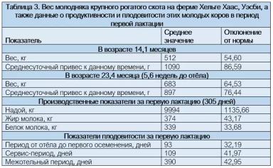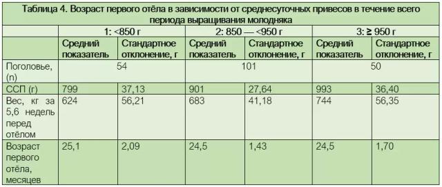 Оценка 205 голов молодняка КРС, которые уже отелились, показала средний возраст первого отёла 24,7 месяца. Эти животные в возрасте 23,4 месяца, то есть за 5,6 недель до первого отёла имели конечный вес 683 кг (таблица 3). Таким образом, с рождения и до этого времени средний прирост живой массы (ЛМЗ) у них составлял 897 г в день, что значительно выше рекомендаций, составляющих 800 г.