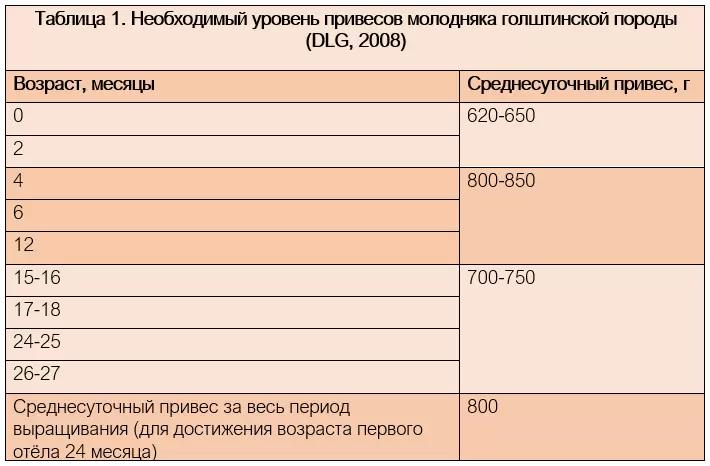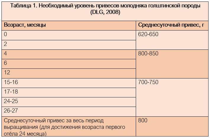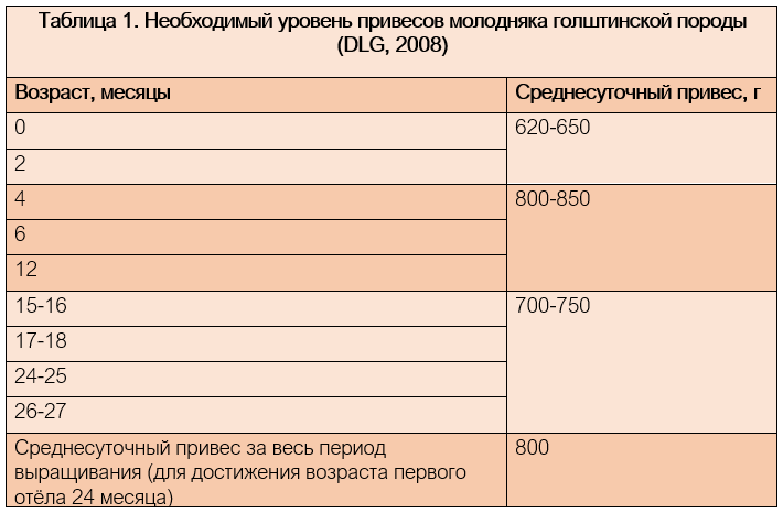 Многочисленные рекомендации, например, со стороны DLG, 2008 (Таблица 1) или Сельскохозяйственных палат, диктуют, что необходимый уровень среднесуточных привесов для голштинской породы при целевом возрасте первого отёла 24 месяца составляет 800 г / день. В течение первых 12 месяцев ежедневный привес должен составлять 850 г, а затем от 700 до 750 г.