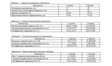 Для выявления влияния сезона на показатели воспроизводства свиноматок в производственных условиях использовали данные уже супоросных свиноматок, численность которых в 1 группе составила 13 голов, а во 2 группе – 16 голов. Анализ проводили, сравнивая многоплодие, плодовитость и крупноплодность.