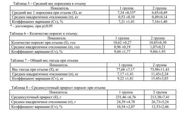 Так, молочность свиноматок первой группы составила 77,68 кг, что выше, чем у свиноматок второй группы на 3,7 кг, однако достоверность разницы этих показателей не подтвердилась.