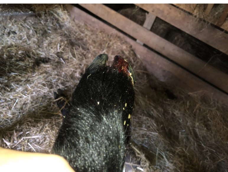 Здравствуйте. Вчера утром все было в порядке, к вечеру заметили, что баран хромает и много лежит, и эту трещину. Сначала крови не было, а сегодня пошла. Нога не горячая на ощупь. Чем можно помочь?