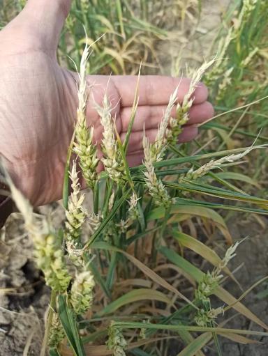 Подскажите, что с пшеницей? Почему закручены колоски? Посев 19.05. Почти нет дождей. Что это может быть - болезни, вредители или все-таки засуха?