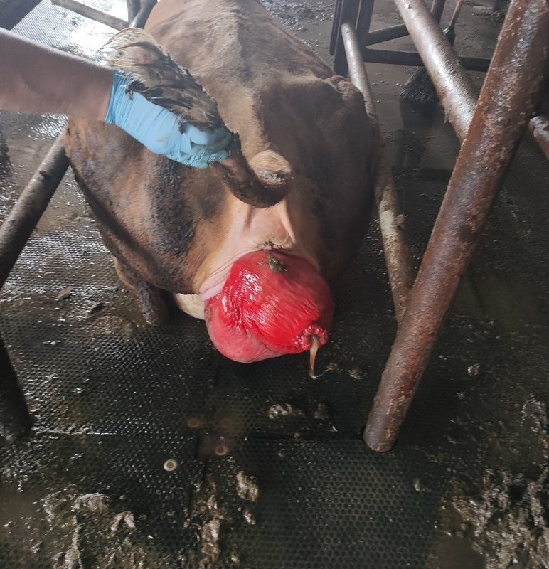 Здравствуйте. Было частичное выпадение, зашили, ходила 2 недели с швами. Потом это все порвалось и вот такая вот картина. До отела 24 дня. Что делать?