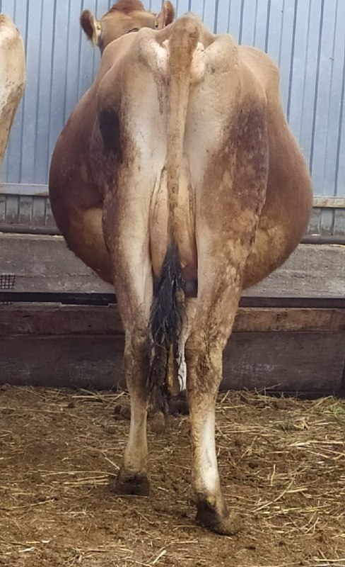Первотелка, месяц было все в норме. Потом корову начало раздувать, рубец и брюшную полость. Стоит круглая как бочка. Голодной ямки не наблюдаю, даже если корова голодная. Если сзади смотреть она как груша, такое состояние примерно месяц. При пальпации рубец тестообразный, плотный. Аппетит хороший, жвачка есть, акт дефекации в норме. Дрожжи не даем. Даем мелкую дробленку, схожая с отрубями (ячмень, овес).