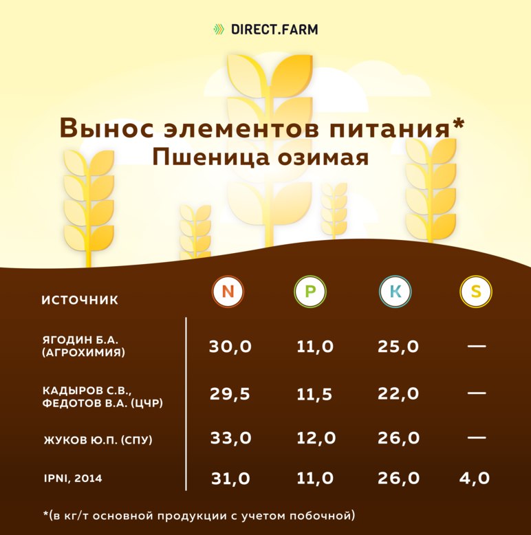 🔶 Удобрения. Ниже представлена инфографика, в которой указывается вынос элементов питания озимой пшеницей. Данные взяты из нескольких литературных источников.