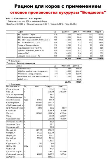 Также, как и обещали, мы разработали рацион с применением силоса из отходов сахарной кукурузы для коров со средней молочной продуктивностью (прикреплен в виде фото).