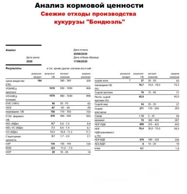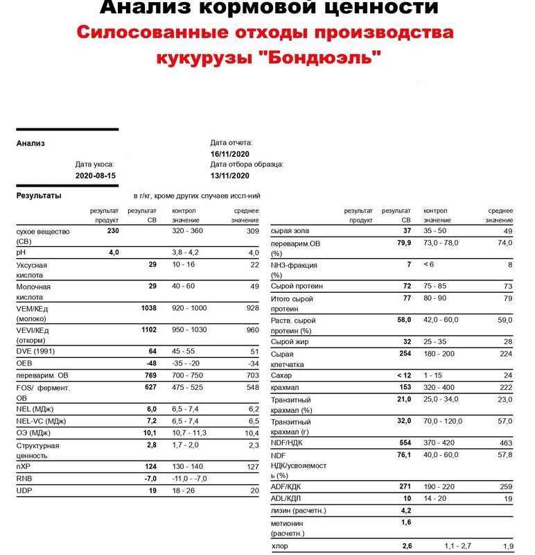 Лабораторные результаты анализа свежих и силосованных отходов производства кукурузы «Бондюэль» прикреплены ниже. Для сравнения силосованных отходов производства «Бондюэль» с классическим кукурузным силосом возьмем данные из статьи «Силос кукурузный».
