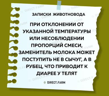 ❗Это очень важно, так как при отклонении от указанной температуры или несоблюдении пропорций смеси (минимум 110 г сухого вещества в 1 л разведённого ЗЦМ) заменитель молока может поступить не в сычуг, а в рубец, что приводит к диарее у телят ( в гортани телёнка находятся рецепторы, которые по вязкости различают воду и молоко: вода поступает в рубец, а молоко в сычуг).