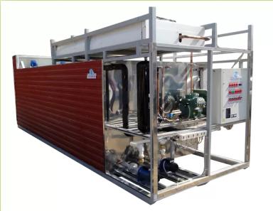 Генератор ледяной воды предназначен для охлаждения оборотной воды в производстве молочной продукции. Емкость изготовлена из нерж. стали AISI 304 толщина 3 мм. Размеры емкости 4500мм х1700мм х1500 мм. . . Термоизоляция емкости экструдированный полистирол. Толщина 60 мм. Крышка изготовлена из экструдированного пенополиуретана. Толщина наращиваемого льда 35 мм. Масса накопленного льда (аккумулятор льда) 4500 кг. Запасенная холодопроизводительность 416 кВт. Испаритель изготовлен из трубы из нержавеющей стали. Крепление испарителя и несущие крепежи испарителя изготовлены из нержавеющей стали. Металлическая конструкция, усиленная для мобильного перемещения изготовлена из квадратного профиля. Компрессор Bitzer (Germany) марки 4NES-20Y-40P 1 шт. Холодопроизводительность: R-22 (R-507) , Q =29, 4 кВт при кипении фреона Т кип. - 10 ˚С. , Т кон. + 45 ˚С. Воздушный конденсатор фирмы «Технохолод». Электрическая схема и фреоновая автоматика изготовлена из компонентов фирмы Danfoss. На каждую электрическую нагрузку устанавливается отдельный магнитный пускатель и тепловая защита. Встроенные системы: поддержание давления конденсации; сушка испарителя; мешалка 2 шт; поддержание давления конденсации; подогрев картера компрессора; котроллер перегрева компрессора INT69; монитор напряжения; автоматическое поддержание толщины намороженного льда; система зимнего пуска. Размеры установки стандартного исполнения 2050х6200х2100 (ширина х длина х высота) мм. Масса установки 2500 кг. Данная установка заправлена фреоном и готова к эксплуатации. Циркуляционный насос марки CEA370/3 (Lawara, Italy) 1 шт. , производительность 25 м3/час при напоре 25 метров. Срок изготовления от 45 рабочих дня. Изготоим генераторы ледяной воды необходимой Вам мощности.